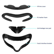 The comfortable and hygienic solution includes the facial interface, which is a ventilated frame with velcro overlay made of leather polyurethane foam. Particularly useful for long sessions or workouts, as it is a wipeable, breathable design. It helps keep you cool while offering a comfortable way to keep your device free of sweat and dirt. The kit also includes a lens protector, which is great for protecting your lenses from scratches and damage and, most importantly, adverse exposure. It is also perfect for transport. The extra space created by the 4-in-1 kit makes it ideal for users of corrective spectacles.