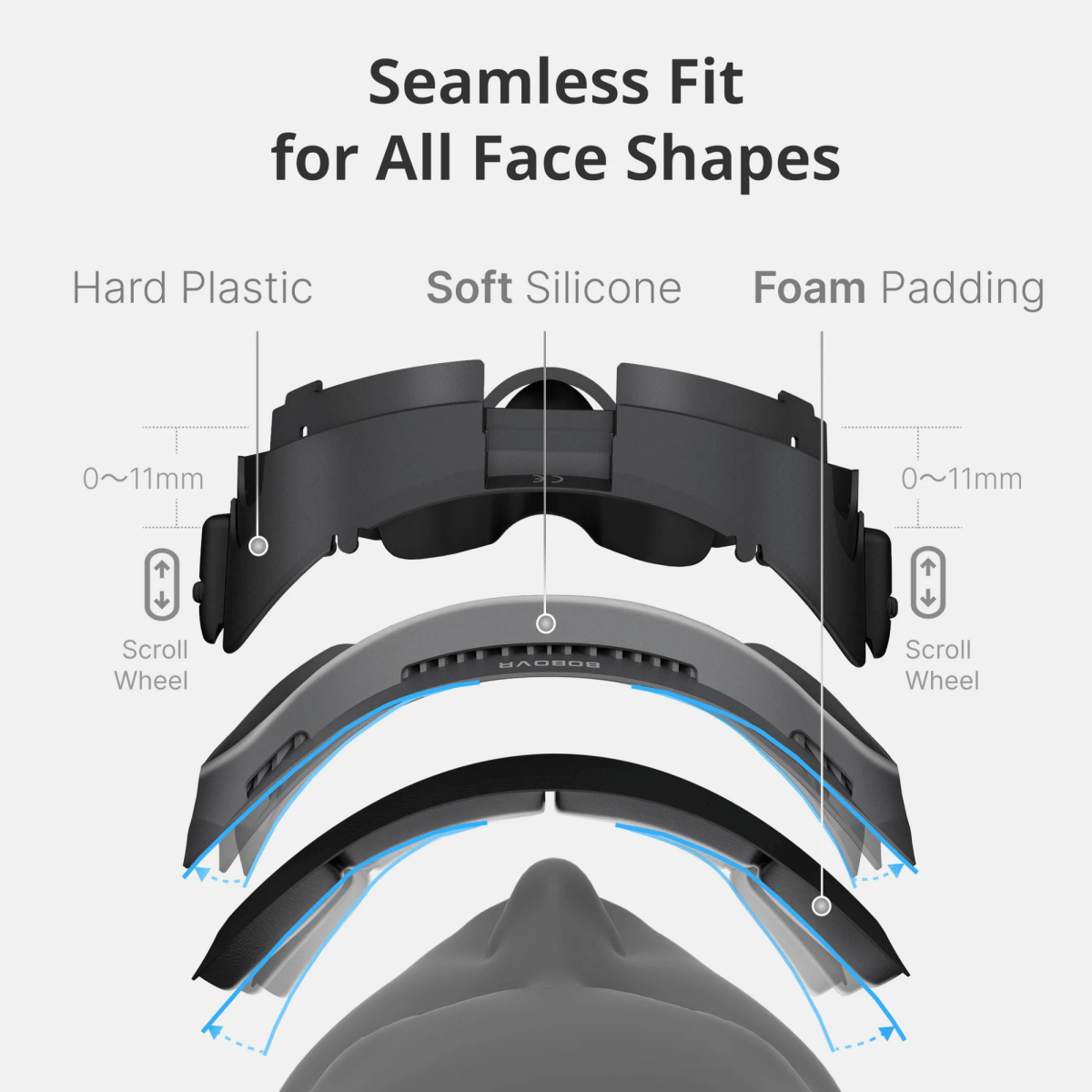 Mousse douce et silicone pour un meilleur ajustement – au lieu d'interfaces en plastique rigide, du silicone doux et de la mousse sont utilisés pour réduire la pression sur les pommettes et le front, s'adaptant à la forme du visage.
